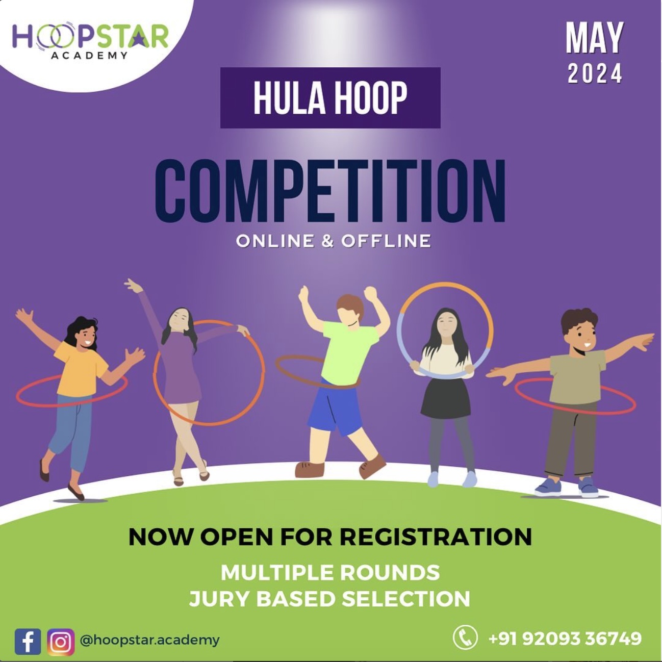 Children who qualify for the second round, have to demonstrate their choreographic ability online. The final round of the competition will be conducted offline. The finalists will join us for the grand finale in Pune/Mumbai. All participants must pay a nominal registration fee of Rs. 499 to become eligible for the Hoopstar Academy Hula Hoop Competition 2024 by April 28, 2024, at https://rzp.io/l/hoopstar-competition-may24.